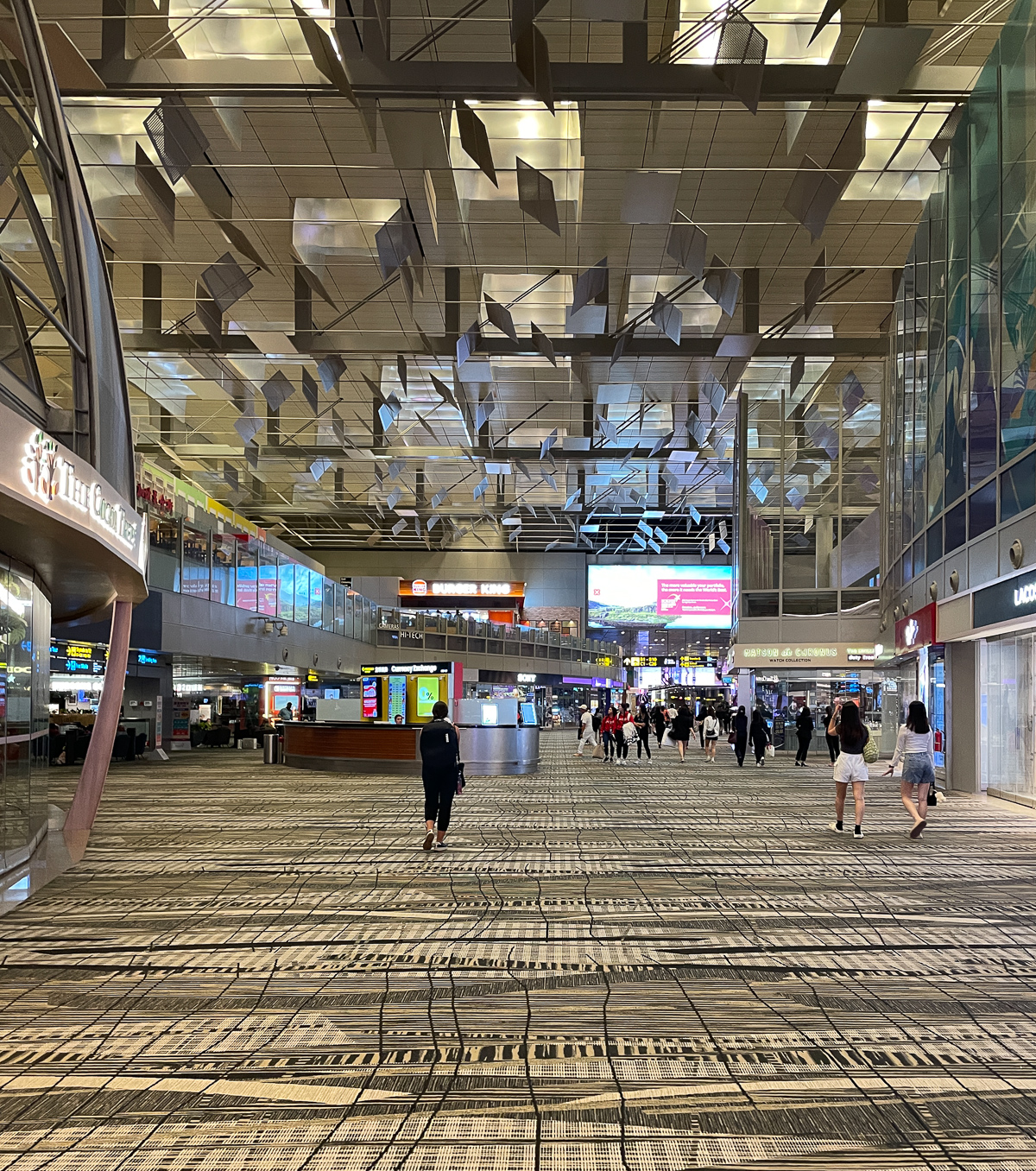 Der Flughafen Changi wäre sehenswert gewesen, aber ich hatte in meiner Lage keine Augen dafür. Nur am Rande bekam ich mit, dass wir mit der Terminalbahn durch einen schönen Garten mit Wasserfall fuhren, und der Flughafen über weite Strecken mit Teppich belegt war.