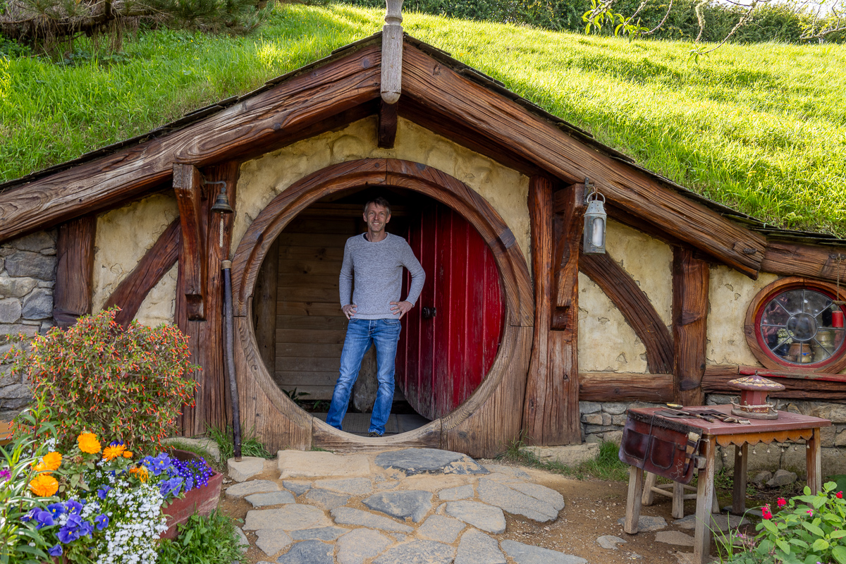 Gegen Ende meines Aufenthaltes hier besuchte ich das Hobbiton. Dies ist das Hobbit-Dorf, das Peter Jackson für die Dreharbeiten seiner Lord-of-the-Rings-Filme verwendet hatte. Ein Ticket musste man lange im Voraus buchen – dies war darum die einzige Aktivität, die ich bereits von der Schweiz aus organisiert hatte. Das Hobbiton war der Grund, weshalb ich diese Unterkunft gebucht hatte. Es befand sich relativ nahe bei Whakamarama, etwa eine Autostunde entfernt – in the middle of nowhere. Jackson flog 1998 mit dem Helikopter übers Land und fand, hier sehe es nach einem geeigneten Platz aus. Die Landschaft bestand aus vielen, sehr kleinen Hügelchen, Gras und vereinzelten Bäumen. Also ging Jackson zum Schafbauer, dem das Land gehörte, und erklärte, was er vorhatte. Der Bauer hatte noch nie etwas von Lord of the Rings gehört und verstand auch sonst nicht, dass hier etwas passieren würde, was sein Leben verändern sollte. Zu Jackson sagte er, er könne gerne das Land inspizieren, aber er, der Bauer, schaue jetzt erst mal die Rugby-Partie zu Ende.