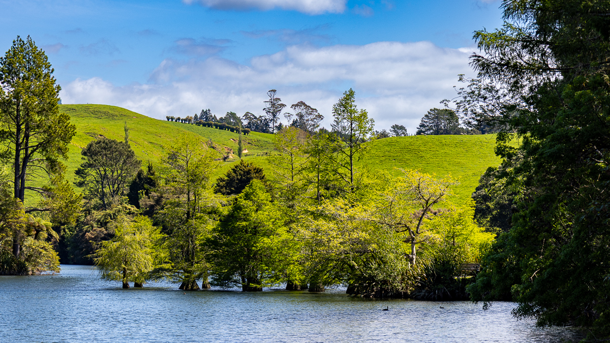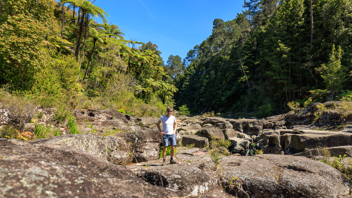 Autofahren im Zentrum von Auckland mit Linksverkehr war für mich nicht gerade stressfrei, aber sobald ich aus der Stadt und den Suburbs heraus aufs Land kam, wurde die Fahrt richtig schön. Die Sonne schien. Das heizte das Auto mit der Zeit mächtig auf, doch es hatte eine Klimaanlage. Ich hielt irgendwo in der Pampa an, um einen Kaffee zu trinken. Später führte die Strasse kurz einem Bach entlang, wo es gebirgig aussah. Wunderschöne Landschaft, aber ich konnte dort nicht anhalten. Etwas später vertrat ich mir die Beine in der schönen Natur. Die Luft war frisch.