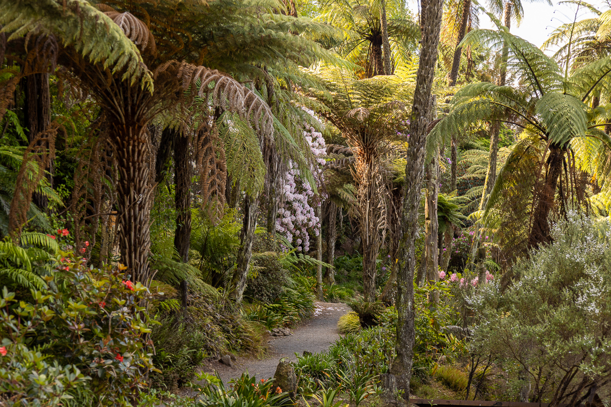 Der nahe gelegene Te Puna Quarry Park war deutlich kleiner als der McLaren Falls Park, aber dafür an einem steilen Hang mit toller Aussicht auf das Meer und den Mount Maunganui. Es roch sehr gut. Mit Skulpturen und anderer Kunst, vielen Häuschen und Sitzgelegenheiten war der Park sehr liebevoll eingerichtet, dazu schöne Pflanzen. Orchideen blühten und grosse Rhododendren.