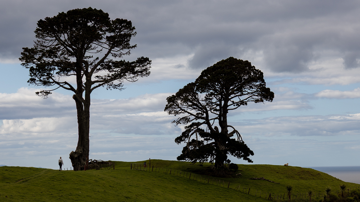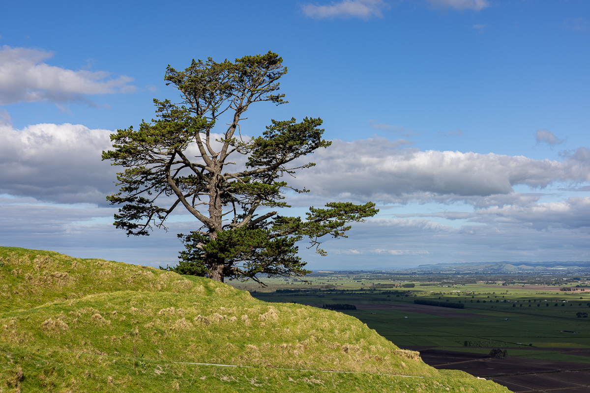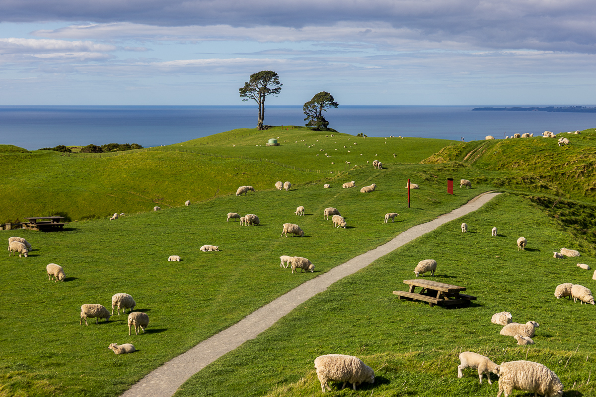 Auch ziemlich in der Nähe befanden sich die Papamoa Hills. Von unten sah es nicht so toll aus; ich wanderte etwa zweihundert Höhenmeter durch eine Schafweide. Oben hatte ich rundherum ein sehr weites Panorama, mit Schafen hübsch über die Landschaft drapiert. Eindrücklich waren diese riesigen, frei stehenden, knorrigen Bäume.