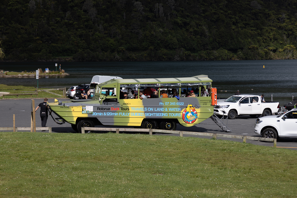 Ein weiterer Tagesausflug führte mich nach Rotorua. Der Kurort ist bekannt für ihre warmen Quellen und liegt an einem See. Ich war enttäuscht. Die Stadt war seltsam leer, tote Hose, Geysire oder so was gab es nicht, nur so dampfende und blubbernde Stellen, die aber nicht schön farbig wie in Island waren, sondern braun. Es gab keine Fussgängerzone, wo man hätte flanieren können, stattdessen sechsspurige Strassen und riesige Parkplatzflächen. Die Besonderheit von Rotorua: es stank überall nach faulen Eiern. Ich blieb nicht lange in der Stadt, sondern fuhr zum nahe gelegenen Blue Lake, der kleiner war als der grosse Lake Rotorua. Er war tatsächlich blau, es hatte auch Leute im Wasser, vielleicht war das Wasser warm, vielleicht waren die Maori aber auch einfach temperaturunempfindlich, jedenfalls hatten sie grossen Spass, dem Gelächter nach. Es hatte ein lustiges Amphibienfahrzeug für Touristen, das in den See fuhr und dort zum Boot wurde. Ich spazierte ein wenig dem See entlang, aber für eine Umrundung hatte ich zu wenig Zeit. Weiter hinten war jemand am Wakeboarden. Vom Blue Lake dauerte es nur fünf Minuten zum Lake Okareka, also besuchte ich auch noch. Hier war nichts los, und ich blieb nur kurz.