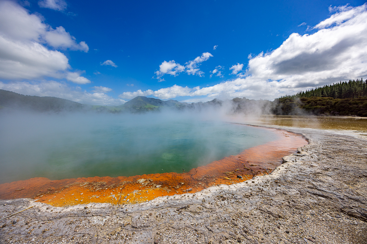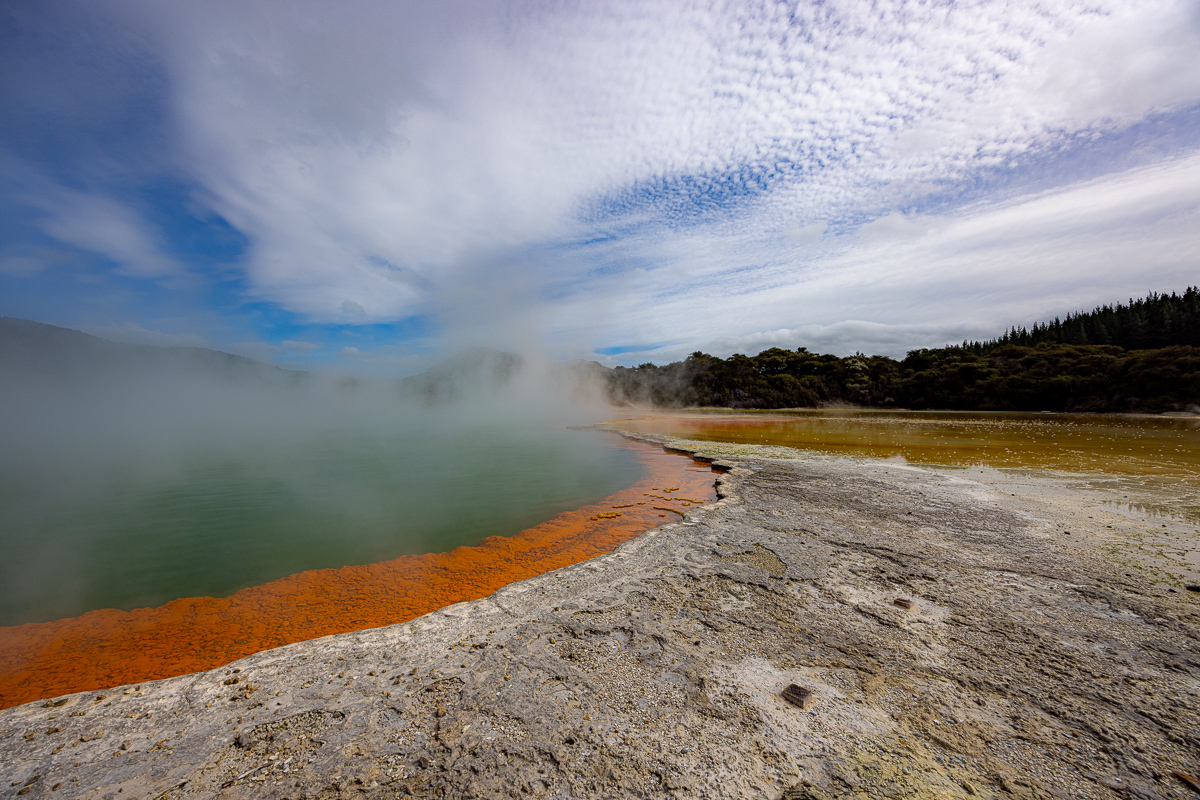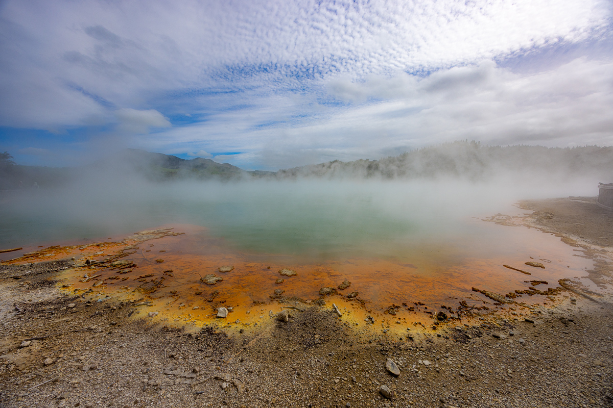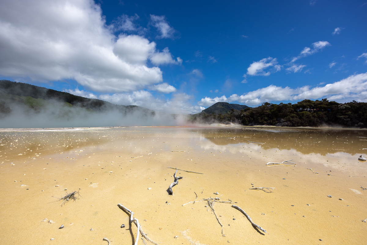 Das Highlight meines Aufenthalts in Taupo war der Ausflug nach Wai-o-Tapa. Das war etwas weiter weg. Wai-o-Tapa lag eigentlich näher bei Rotorua als bei Taupo. Ich war trotzdem früh dort – mein üblicher Trick, um grösseren Menschenmengen auszuweichen. Es funktionierte perfekt. Um halb zehn war noch praktisch niemand im Park, als ich um halb zwölf rausging, war alles voll. An diesem geothermisch aktiven Ort dampfte und blubberte es, und an gewissen Stellen gab es sehr schöne Verfärbungen, so wie ich es von Island kannte. Nachdem ich vom Geblubber in Rotorua enttäuscht war, gefiel es mir hier viel besser. Geysire gab es allerdings nicht, abgesehen von einem künstlichen, der nicht zur Parkanlage gehörte und den ich auch nicht anschauen ging.