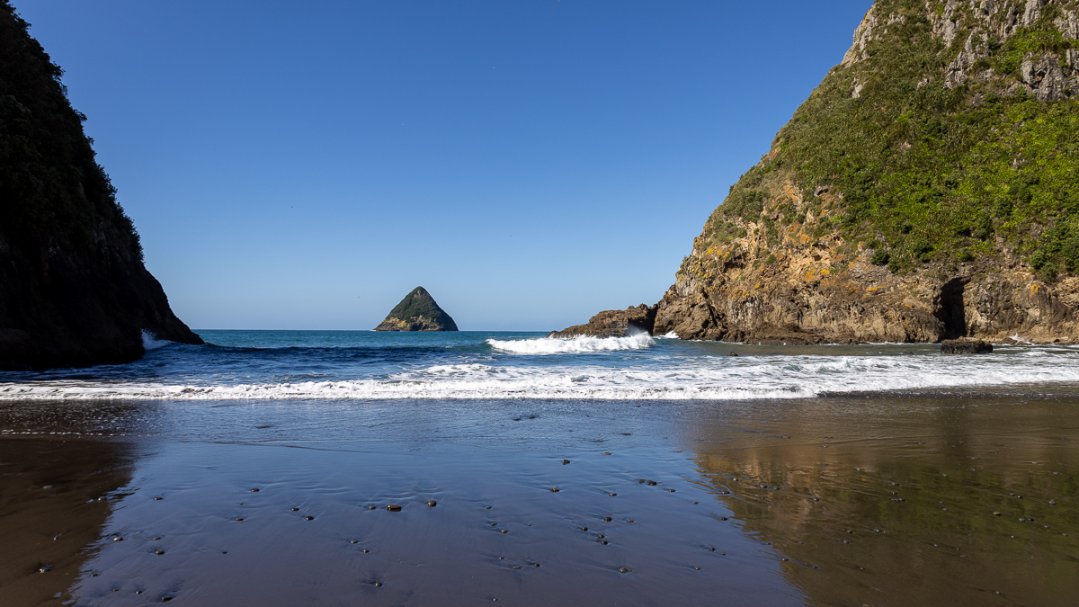 Noch besser dann die Wanderung den Mount Taranaki hinauf bei anfänglich allerschönstem Wetter. Auf den Gipfel wollte ich nicht, das wären laut Wegweiser acht bis zehn Stunden gewesen, möglicherweise auch mit Klettern verbunden und nicht ungefährlich. Ich ging einfach Richtung Gipfel, zuerst durch einen Wald, erstaunlich schnell war ich aber über der Waldgrenze und hatte eine fantastische Aussicht. Ich wanderte bis zu einem Turm mit einer Antenne oder so was; es war nun kurz nach elf Uhr. Der Gipfel war dann bereits in den Wolken. Am Nachmittag fuhr ich an den schönen Paritutu Beach mit markanten Felsinseln und schwarzem Sand, erlebte also das Neuseeland-Klischee «Schneeberge und Strand an einem Tag». Bei Ebbe kraxelte ich auf eine der Inseln, was die Möven dort allerdings gar nicht cool fanden – sie schrien mich an, als gäbs kein Morgen. Also kehrte ich um und holte mir nasse Füsse, weil die Ebbe schon wieder vorbei war.